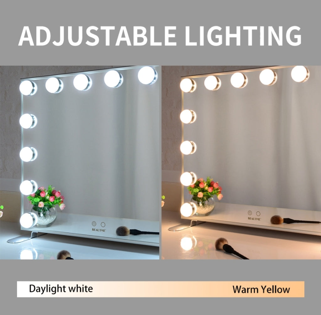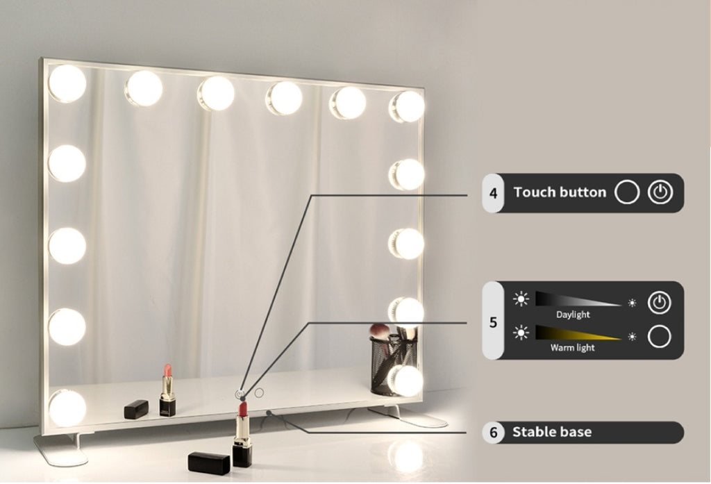 • FOMO VANITY MIRROR WITH LIGHTS-14pcs Led bulbs, with touch control, three tone settings (warm light / daylight / cold light) allowing you to get the most natural application of makeup, even at night.